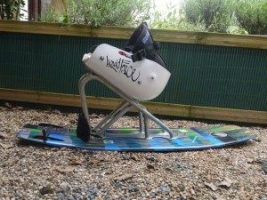 Le Wake Assis Concept de Magic Bastos est constitué de plusieurs éléments : une structure de tubes soudés et cintrés en aluminium, une assise en carbone adaptée au gabarit du pratiquant, une planche de wakeboard classique et un système de fixation pour les pieds.