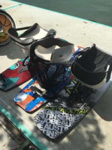 Contrairement au ski nautique, au lieu d’utiliser des skis, la personne utilise une planche, ceci assure plus de maintien. Sur cette planche, on retrouve deux fixations pour les pieds dans le sens de la largueur, comme sur un snowboard ou un skateboard.