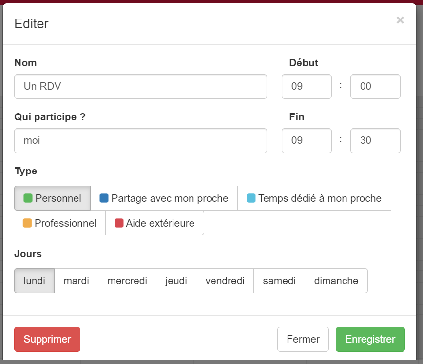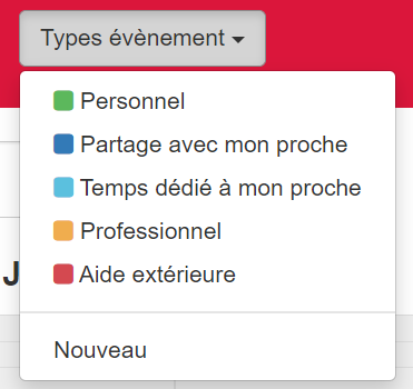 - Ajoutez vos activités sur les créneaux horaires de votre choix afin d’identifier vos temps dédiés et ceux dédiés à votre proche : soit en cliquant sur la partie « Types d’évènements » en haut à droite ou soit en cliquant n’importe où sur la grille.