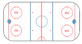 Une partie est divisée en trois périodes de 15 minutes chacune et chaque équipe est composée de 6 joueurs comprenant un gardien de but. La patinoire est organisée de la manière présentée sur la photo ci dessous: