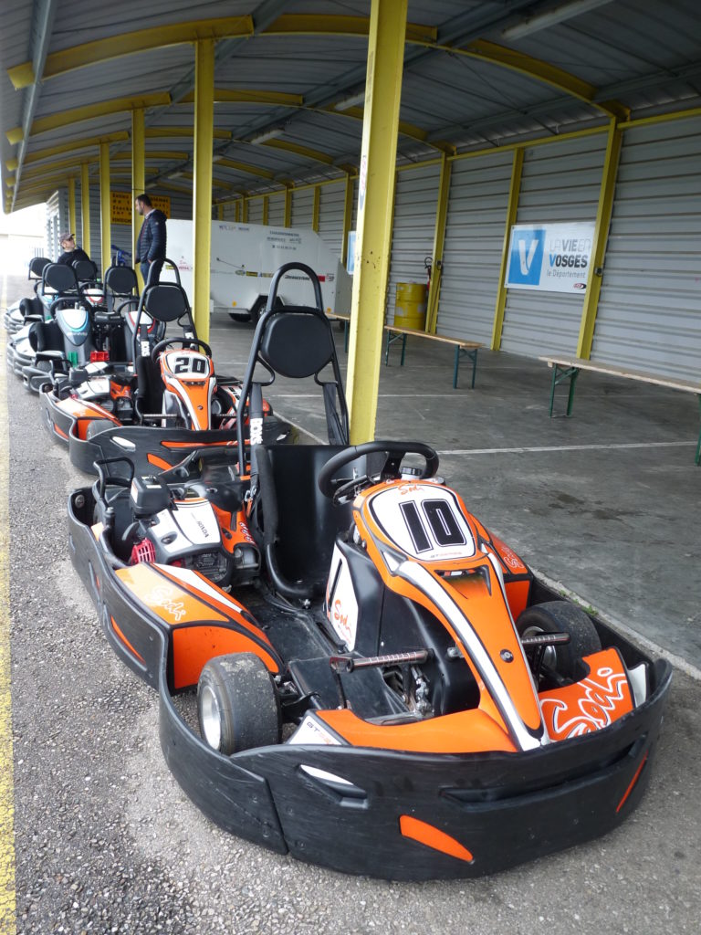 Il est déjà 14h30, nous n’avons pas vu le temps passer et Bertrand nous lance un » Bon allez ! Nous sommes venus pour faire du karting à la base ! ». Sur ce, nous nous dirigeons tous sur les pistes . On s’équipe: gant, casque et Go !