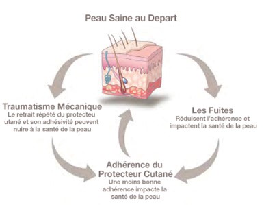 Les effluents sont corrosifs pour la peau. En retour, cela peut rendre plus difficile la bonne mise en place du protecteur cutané sur la peau. Si l’appareillage ne s’adapte pas bien autour de la stomie, il peut en résulter des fuites. Une adhérence compromise peut entraîner d’autres fuites et des lésions cutanées. Une mauvaise adhérence ou un protecteur cutané mal ajusté peuvent entraîner une augmentation de la fréquence de changements, ce qui peut occasionner des lésions d’arrachage. C’est un cercle vicieux qui devient difficile à résoudre, proportionnellement à la sévérité de la CPP.